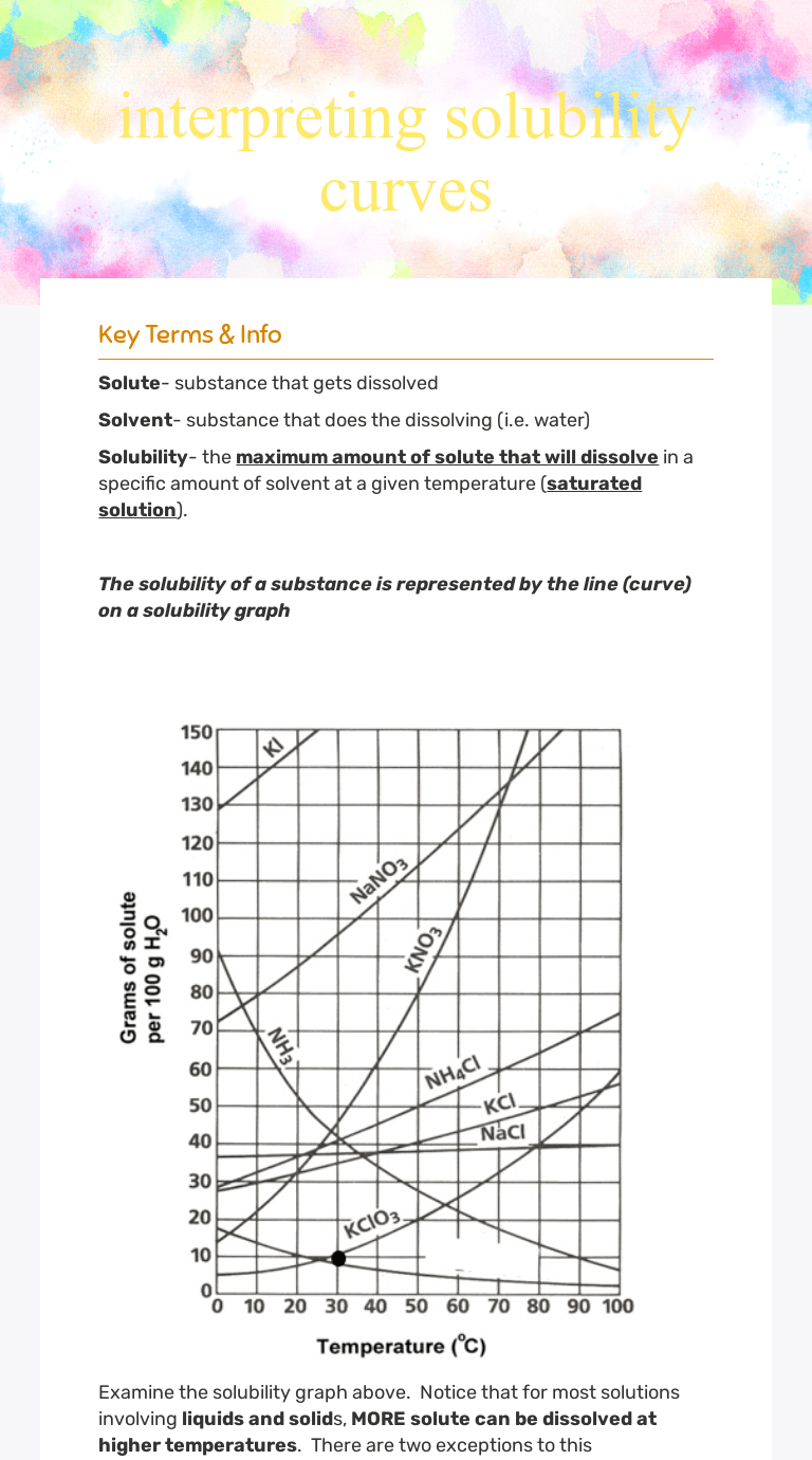 This product consists of a 25 question practice worksheet and answer key regarding solubility curves. Students will be answering a . It contains plenty of examples and practice problems on . Use the graph to answer the following questions. More lessons for igcse chemistry math worksheets a series of free igcse chemistry activities and . What are the customary units of solubility on solubility curves? The curve shows the # of grams of solute in a saturated solution containing 100 ml or 100 g of. Solubility curve practice problems worksheet 1.vu'll notice that for most substances, solubility increases as temperature increases. Use your solubility curve graph provided to answer the following questions. Use the graph to answer the following questions. Use the graph to answer the following questions. If the question requires a calculation, show all work to . Solubility curve practice problems worksheet 1.